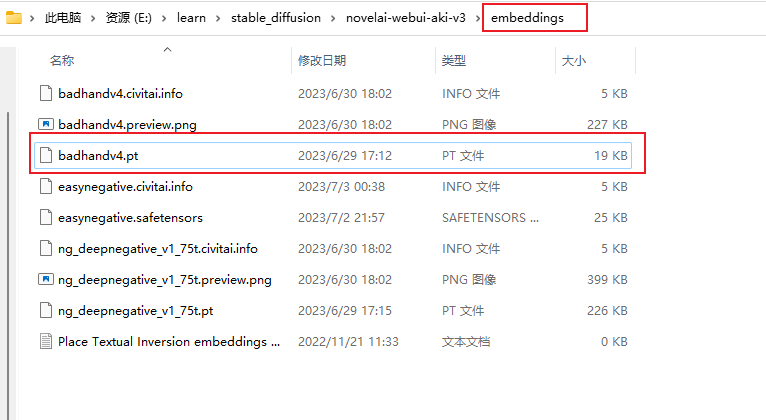 我们点下反向提示词框,再点下这个模型就自动输入了,跟lora模型的使用方式类似,